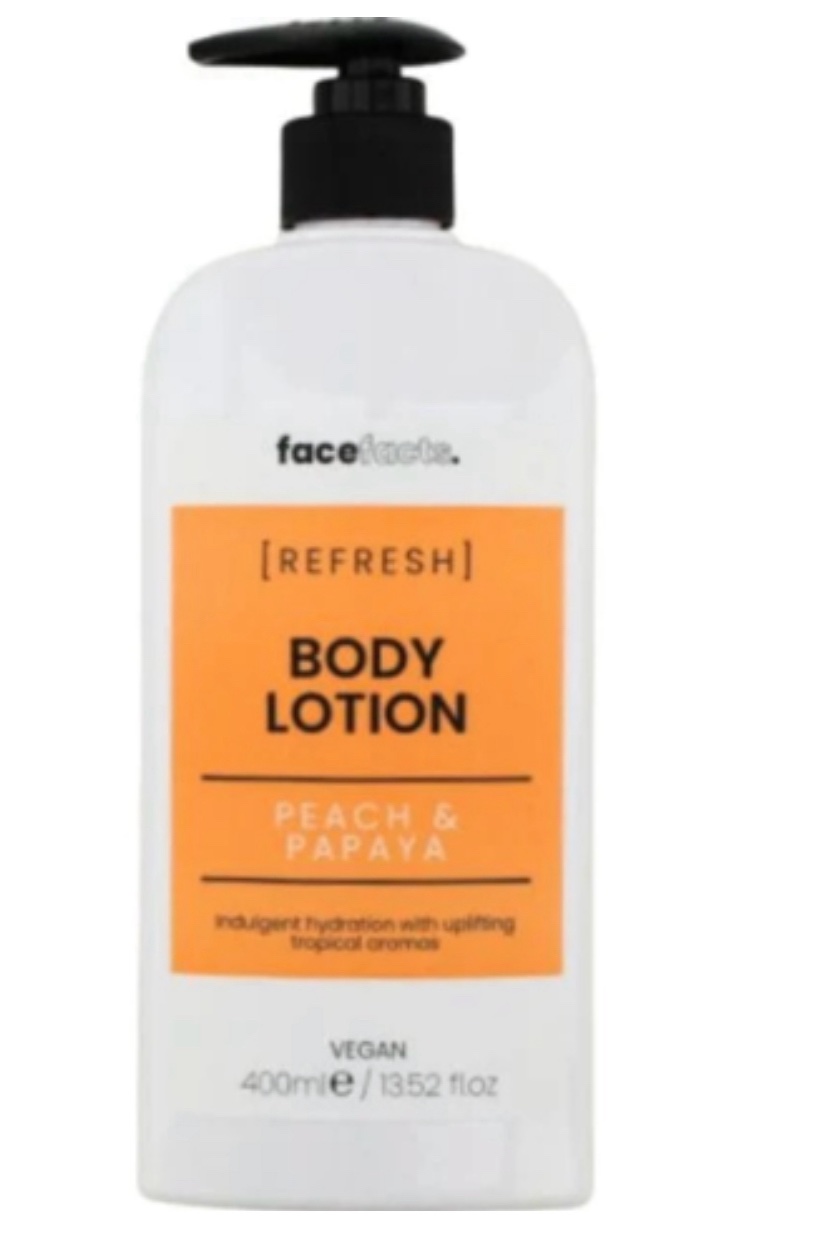 FaceFacts Refresh Peach & Papaya Indulgent Body Lotion (400ml) is a fast-absorbing, lightweight, vegan moisturizer that hydrates and softens skin. Infused with peach and papaya extracts, it provides a tropical scent while nourishing the skin to leave it soft, smooth, and radiant.
