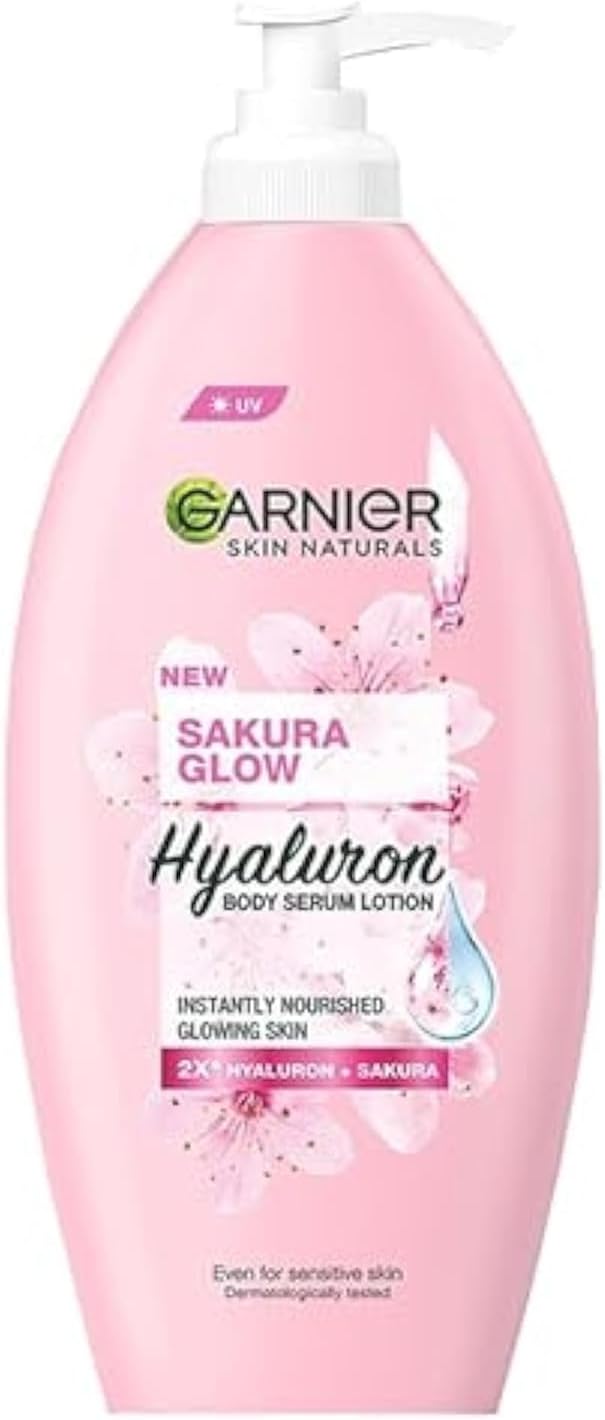 Garnier Sakura Glow Hyaluron Serum Body Lotion (400ml) is a fast-absorbing, non-sticky lotion that deeply hydrates, brightens, and smoothens skin using Sakura extract and hyaluronic acid. It aims to provide a pinkish-white glow within one week, while offering UVA/UVB protection to prevent sun damage.