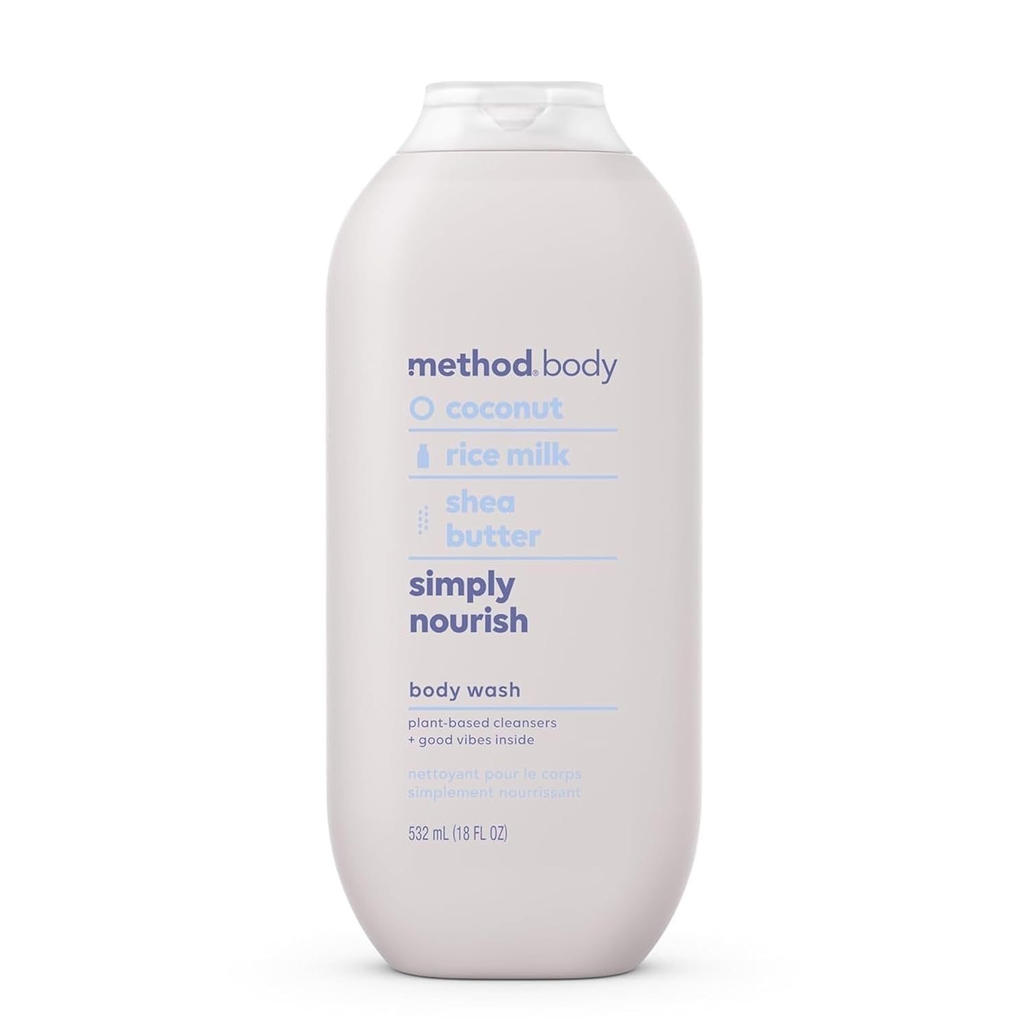 Method Body Simply Nourish (Coconut & Rice Milk) is a plant-based, creamy body wash that cleanses skin without stripping moisture. It uses shea butter and natural ingredients to soften, nourish, and hydrate skin, leaving a light scent while being parabens-free, phthalate-free, and cruelty-free